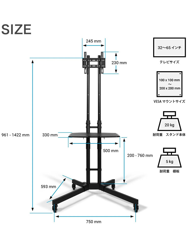 ■商品概要・型番:DKS-TCG2・対応機種:DKS-4K43DG4/DKS-4K55DG4/DKS-4K65DG4・対応ディスプレイサイズ:32-65インチ・VESAマウントサイズ:(V)100×(H)100〜(V)200×(H)200mm・対応重量:〜20Kg・棚板耐荷重:〜5Kg・チルト:非対応・棚板サイズ:W500 x L330 mm・本体サイズ:約W750×H1428.5×593mm (H967.5〜1428.5mm 無段階調整)・本体重量:約12.2kg・保証期間:1年*1 全ての製品の適合を保証する物ではございません。